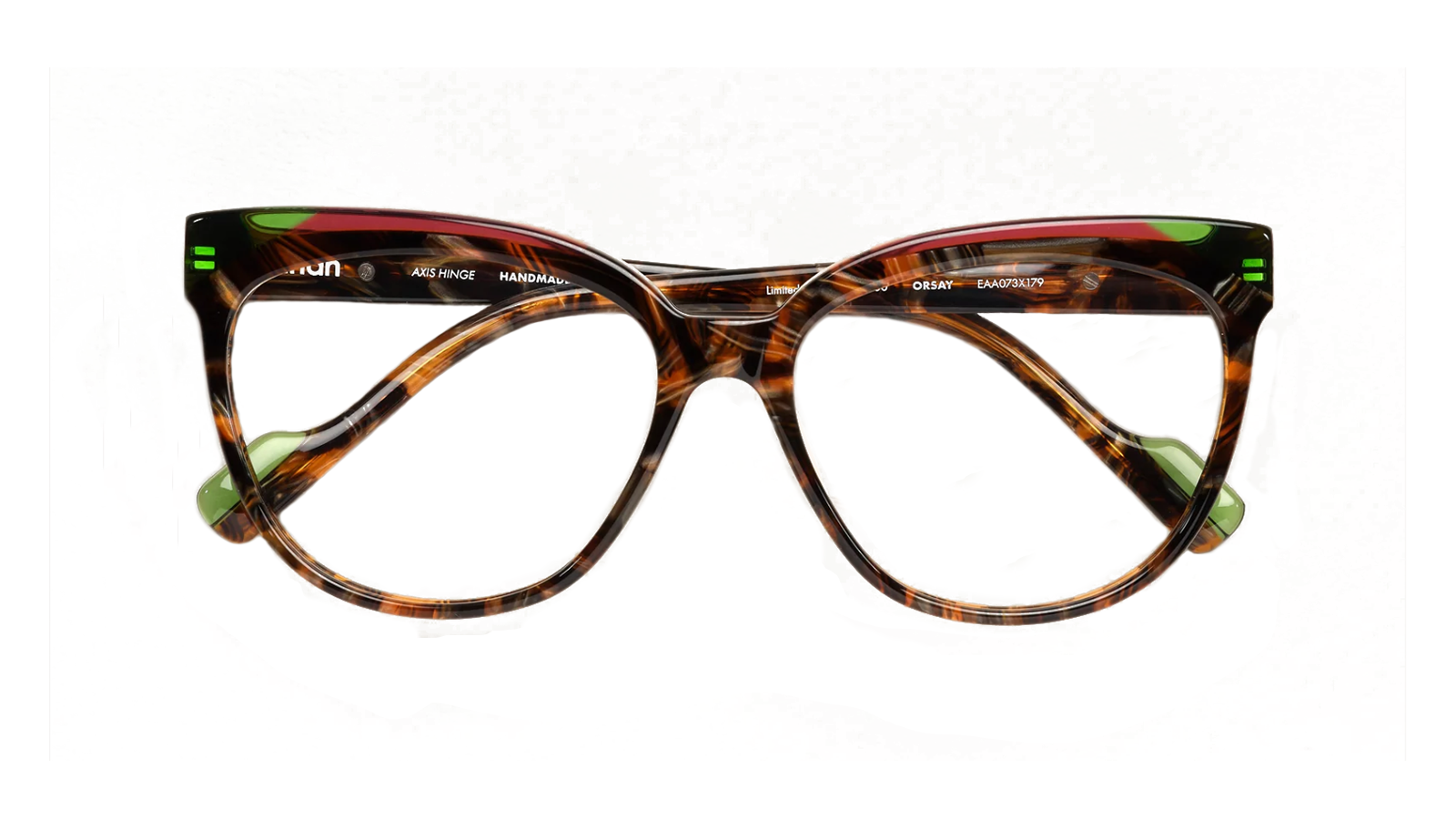 La monture Orsay, créée à partir de trois teintes élégamment associées, témoigne de nos recherches approfondies en explorations chromatiques : audace, distinction et raffinement. Ce modèle oversize séduira par sa finition douce et soignée au niveau de la pointe, réimaginant avec finesse le style intemporel œil-de-chat.
