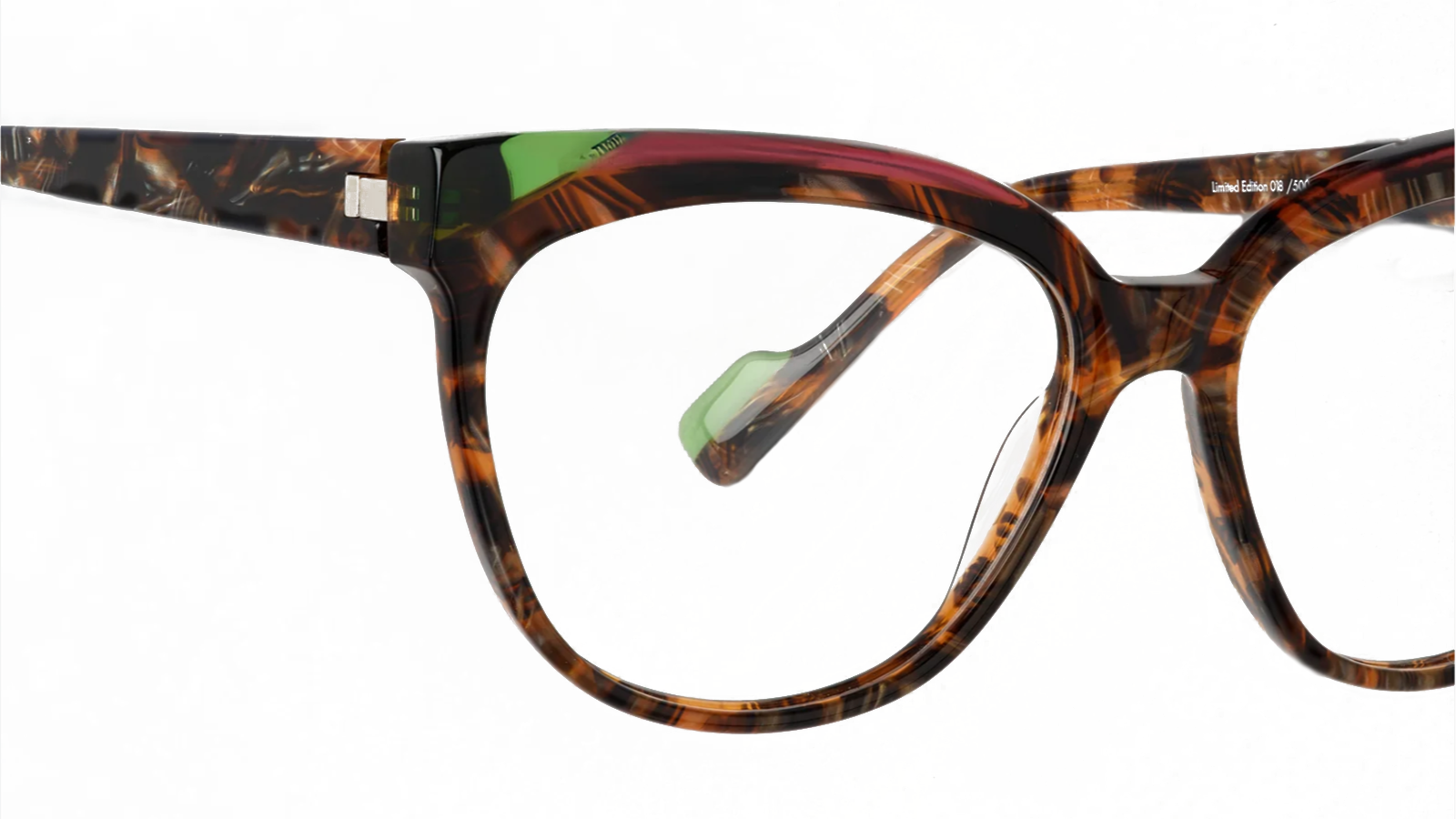 Une monture généreuse, tout en épaisseur et en rondeur composées de collages d’acétate assemblés comme une marqueterie, où chaque motif devient une signature. Elle explore le collage architectural, mariant trois couleurs qui sculptent la monture avec subtilité ou intensité. Elles ne sont pas faites pour se fondre dans le décor, mais pour le ponctuer. Un trait de plume, précis et assumé, qui vient signer une silhouette.