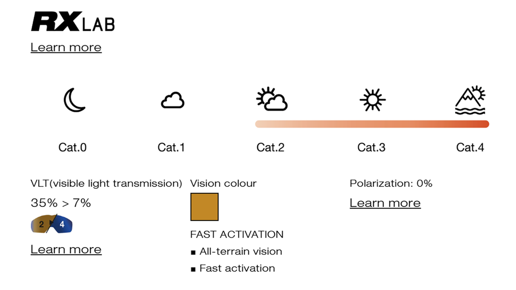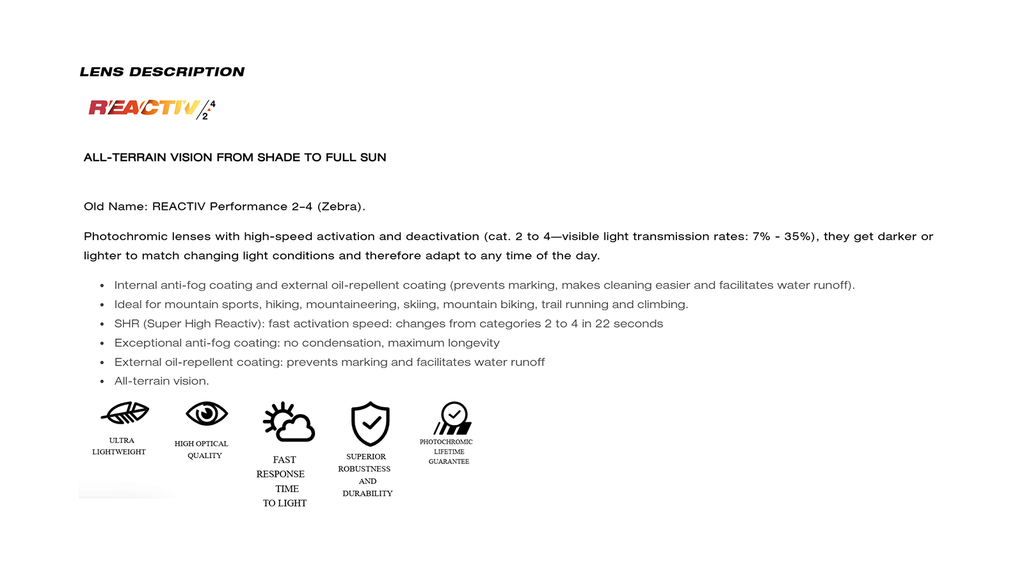 Photochromic lenses with high-speed activation and deactivation (cat. 2 to 4—visible light transmission rates: 7% - 35%), they get darker or lighter to match changing light conditions and therefore adapt to any time of the day.
